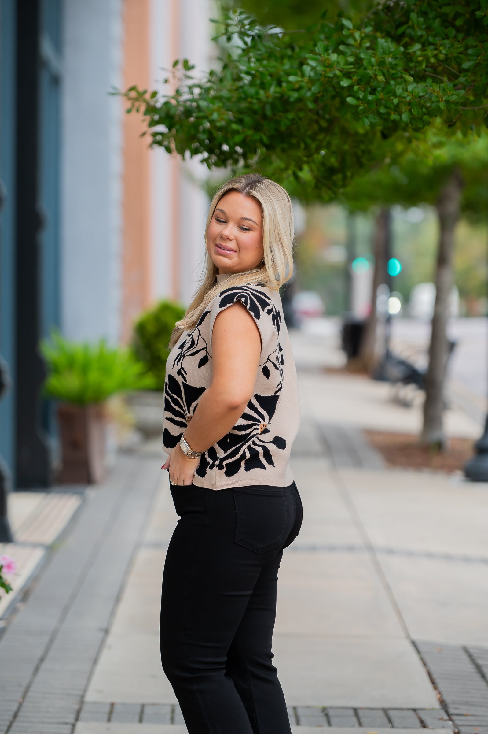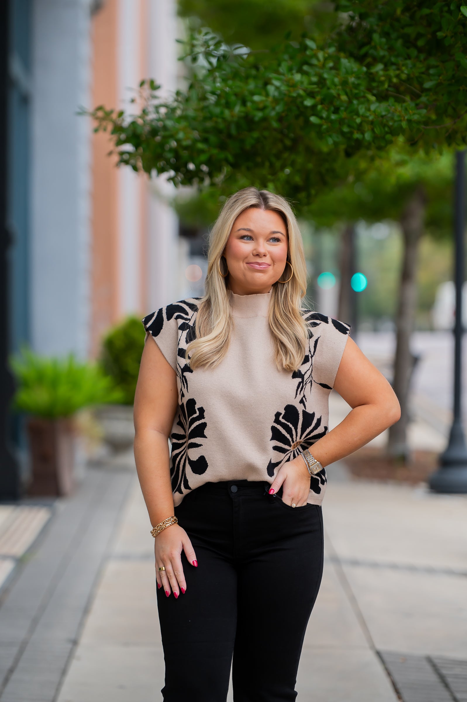 Turn heads with the Talley Sleeveless Floral Sweater in Tan, where cozy meets chic in light tan with bold black floral details on each side. This high-neck muscle knit pullover offers lightweight warmth without the bulk, perfect for layering or wearing solo.