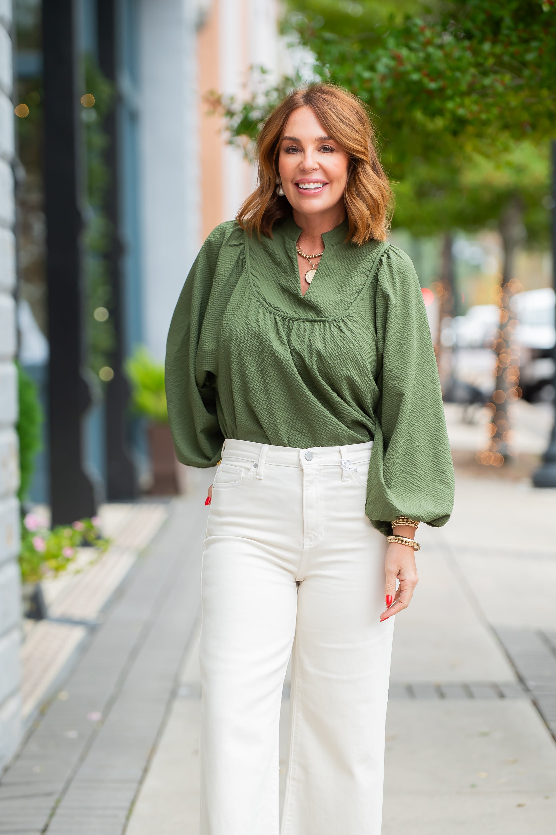 Add a fun twist to your denim with the Teddy Textured Top. Crafted from olive green textured fabric, it features a charming split v-neckline and a round yoke front for a stylish touch. The playful balloon sleeves bring a lively, whimsical vibe that effortlessly updates your everyday look. Perfect for mixing comfort with personality!
