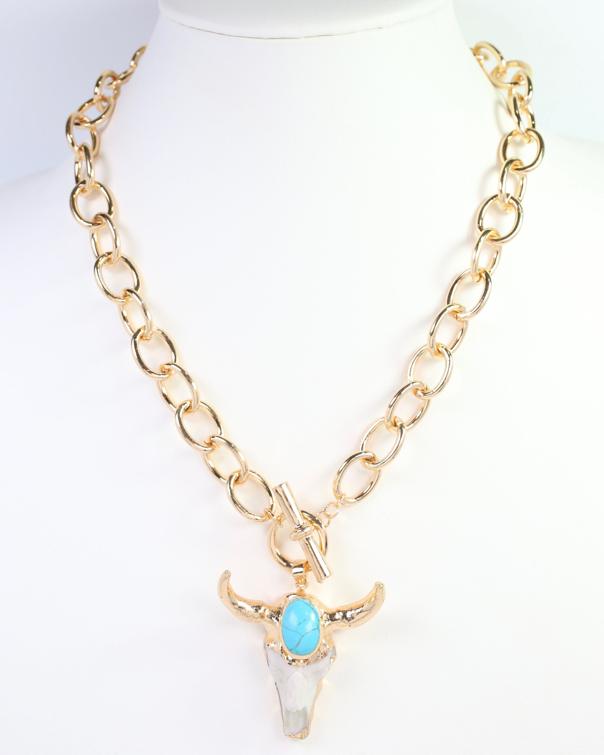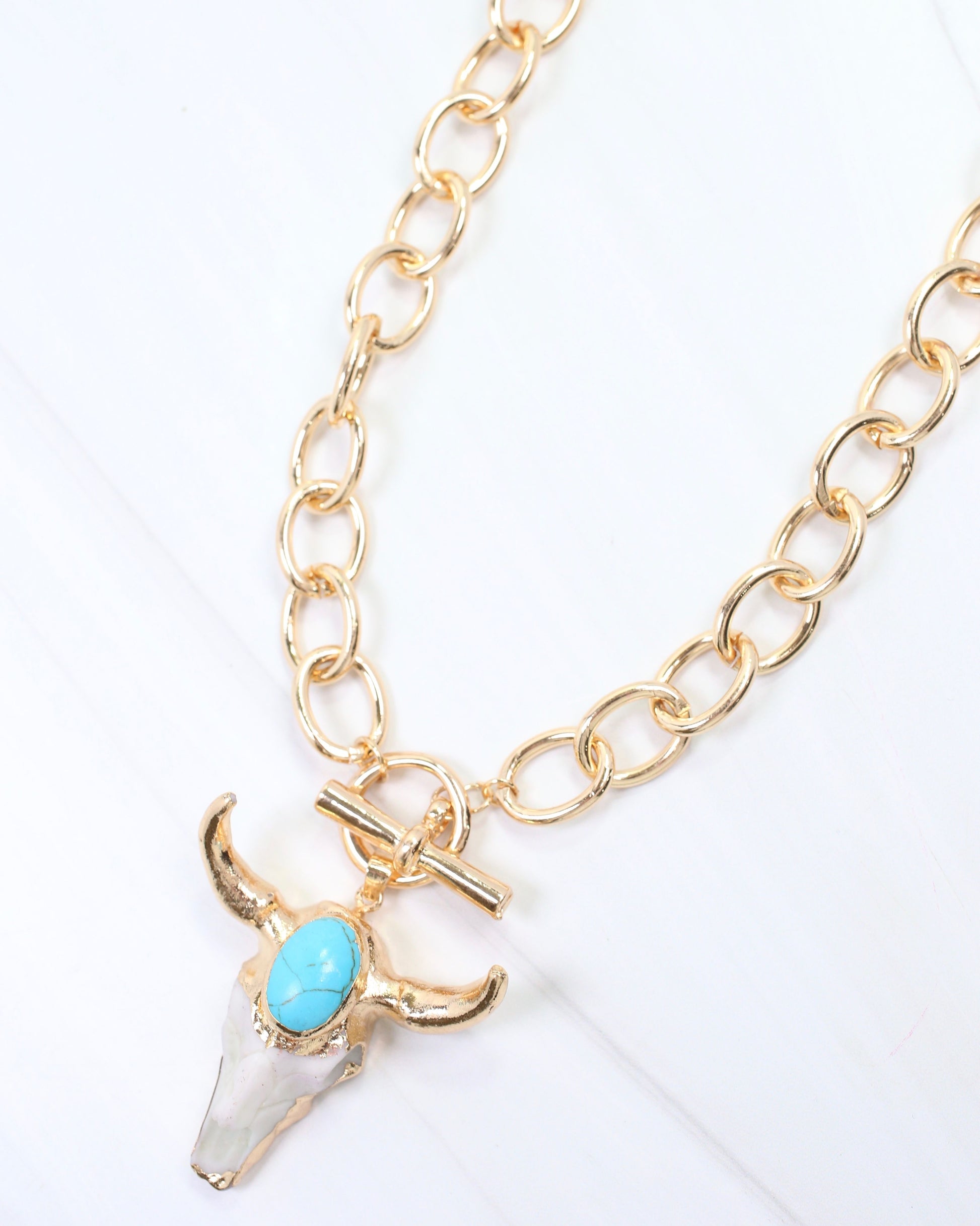 Channel bold Western style with the Tombstone Bull Necklace in gold. This striking pendant features a sculptural bull head accented with a vibrant turquoise stone, creating an eye-catching focal point. Perfect for those who embrace statement jewelry, this piece adds personality and edge to any outfit.