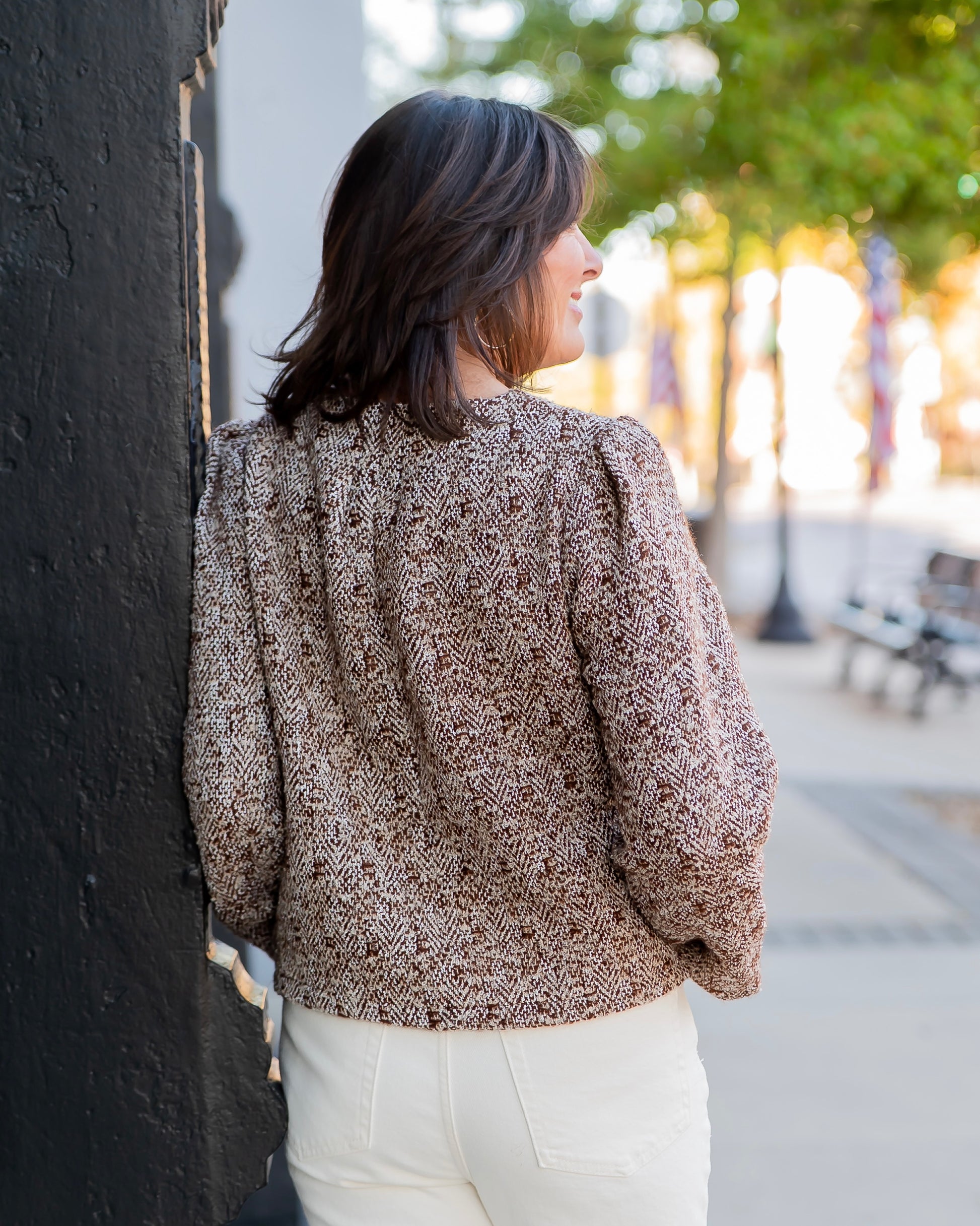 The Tifton Blazer is your new go-to layering essential. This double-breasted beauty features a sophisticated brown and ivory herringbone tweed that works with everything in your closet. Gold buttons add a touch of polish, while the round neckline keeps things effortlessly chic. Throw it over a dress, tee, or sweater for instant elevated style—it's the piece that makes every outfit feel intentional and put-together.