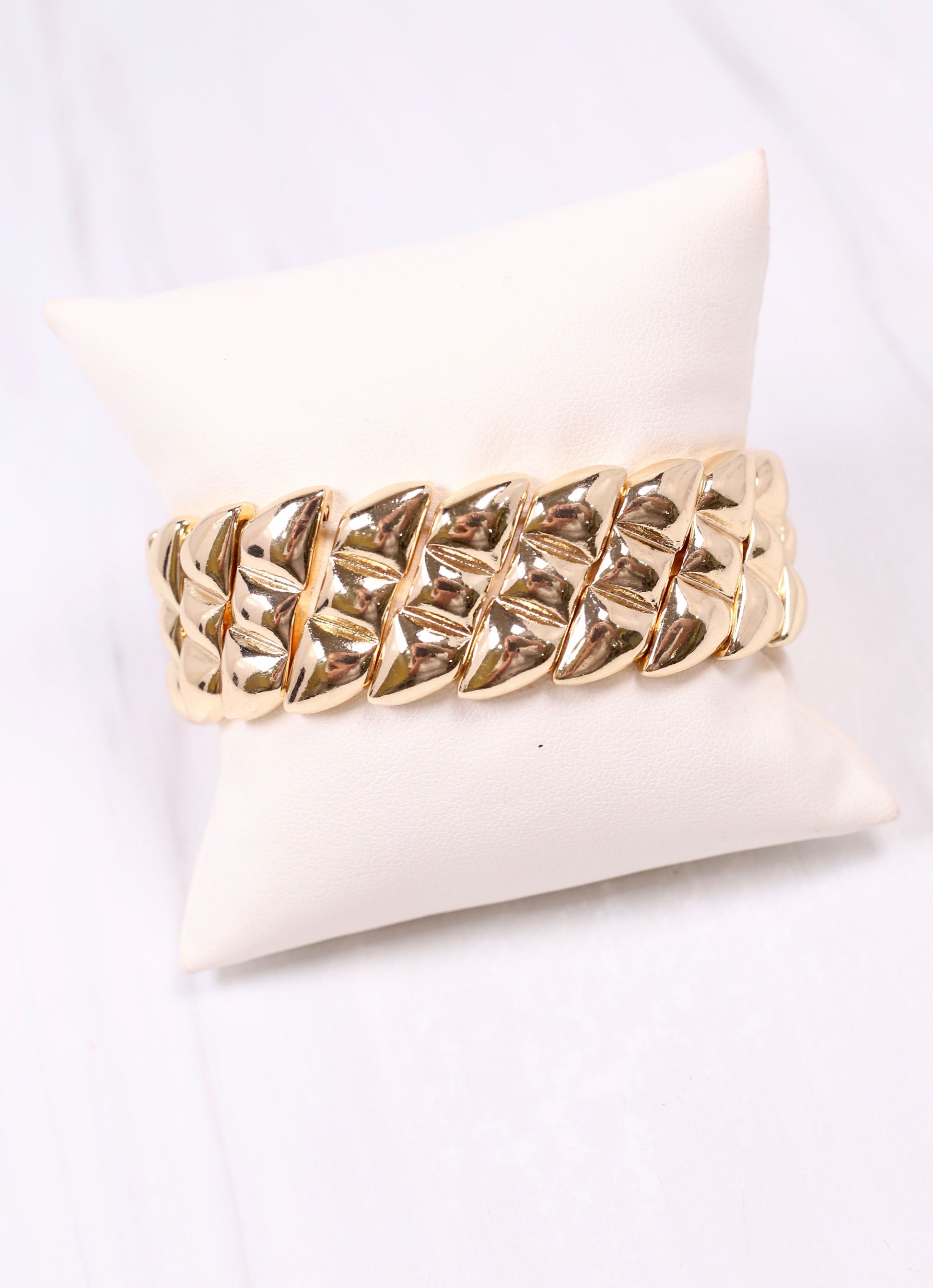 This metal stretch bracelet has a shiny finish with a slightly edge look. It's the perfect selection to wear by itself and can easily be styled in a fuller stack as well.