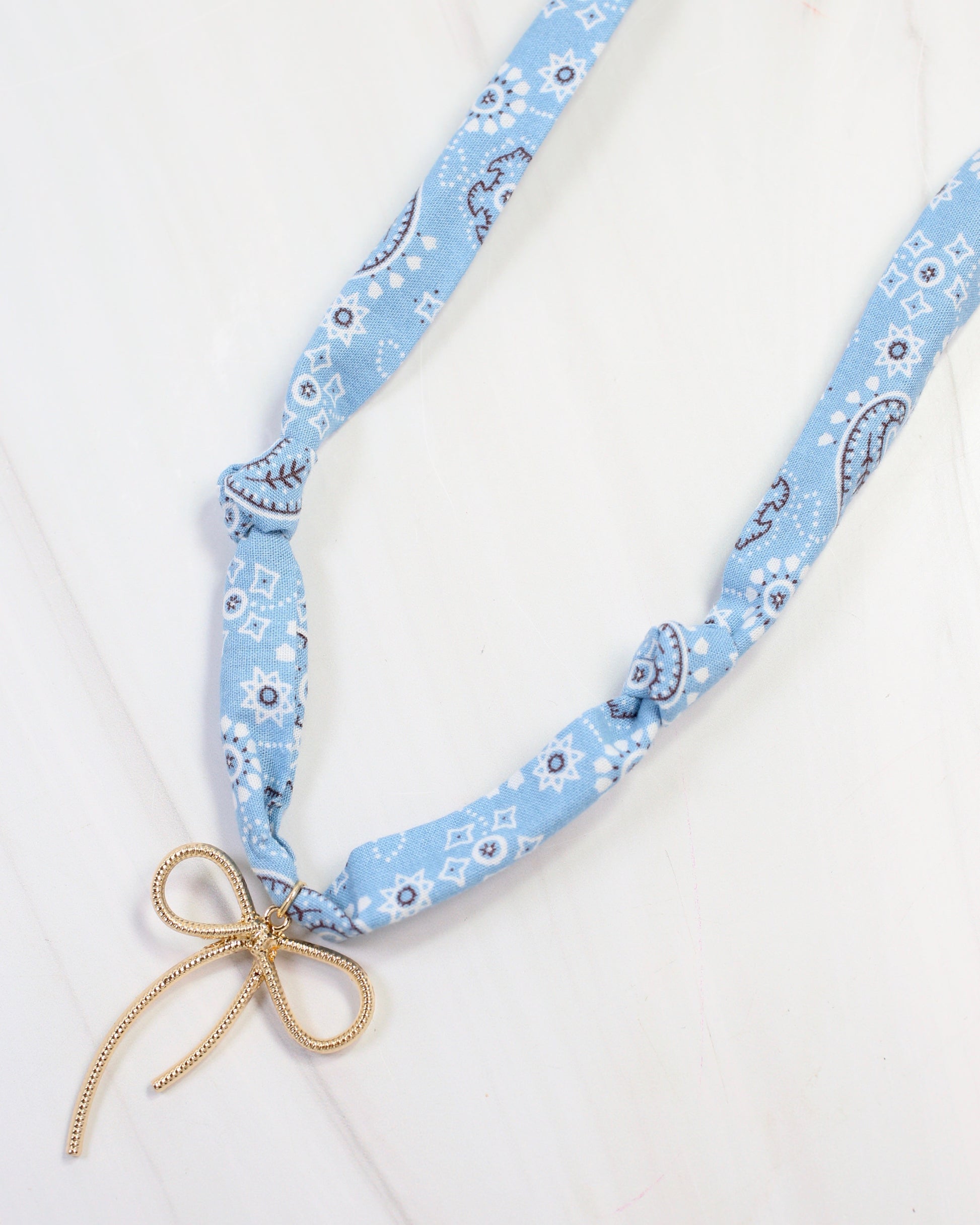 The Tyndall Scarf Charm Necklace in Baby Blue blends playful charm with classy style. This bandana-style scarf features a soft baby blue and white pattern, finished with a textured gold bow charm for a delightful touch that brightens any outfit.