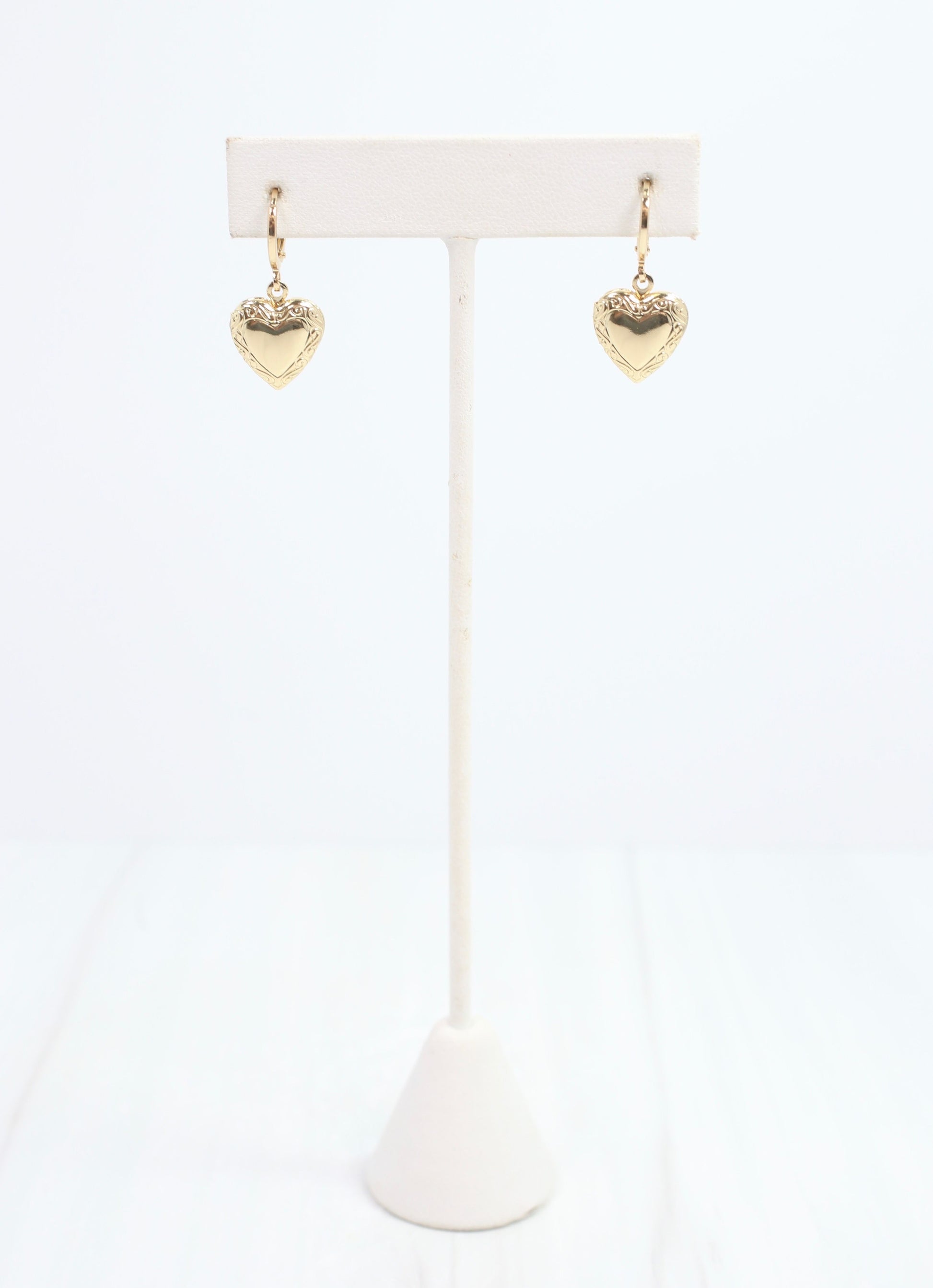 This simple huggie hoop earring features a shiny gold heart locket accent. The charm is functional and opens from the side as well.
