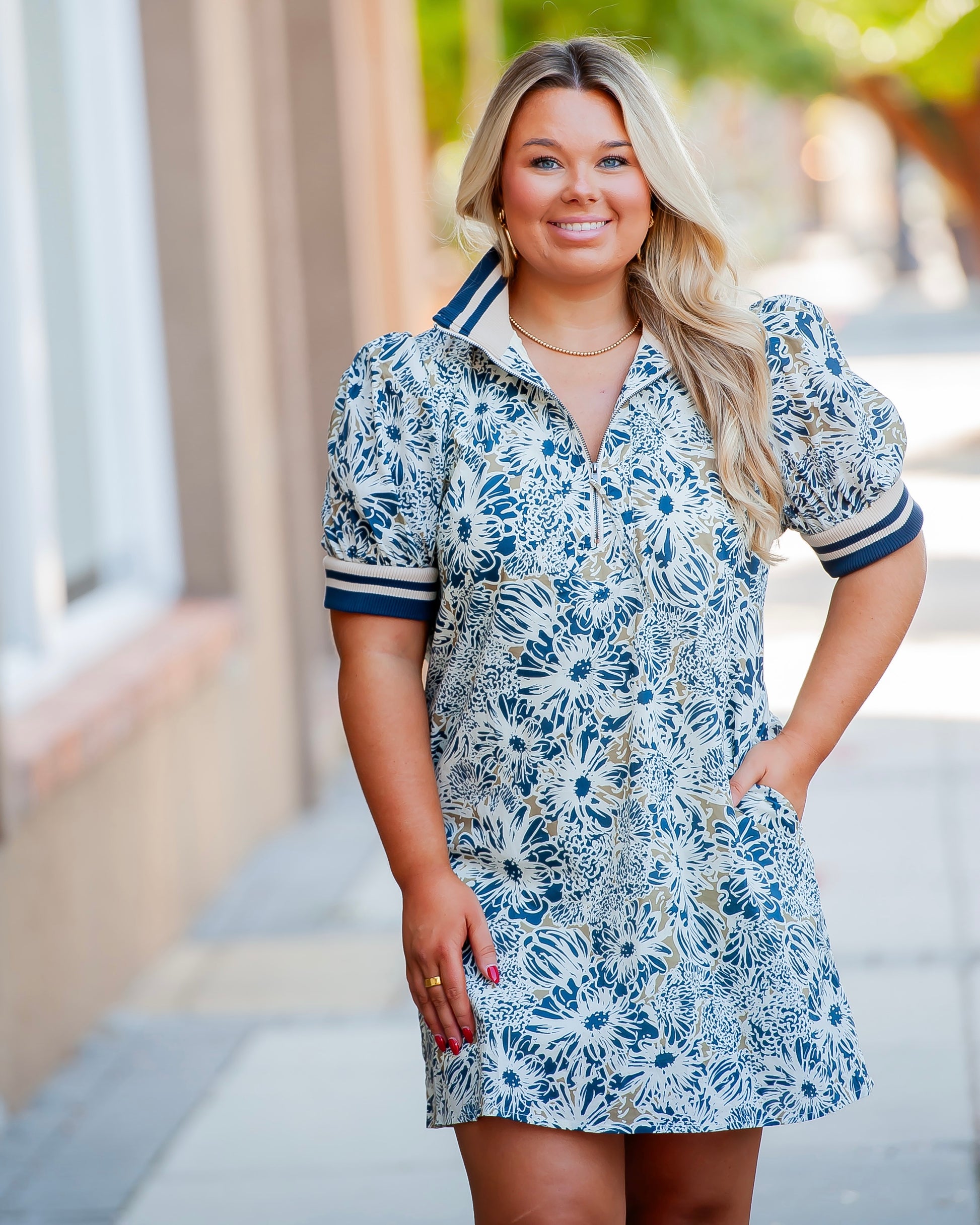 Step out in style with the Vera Zip-Up Floral Dress in charming slate blue. This playful mini dress features a vibrant floral print, short puff sleeves, and a convenient front zipper. Multicolor ribbed trim adds a fun pop of color, while side pockets bring practical charm.