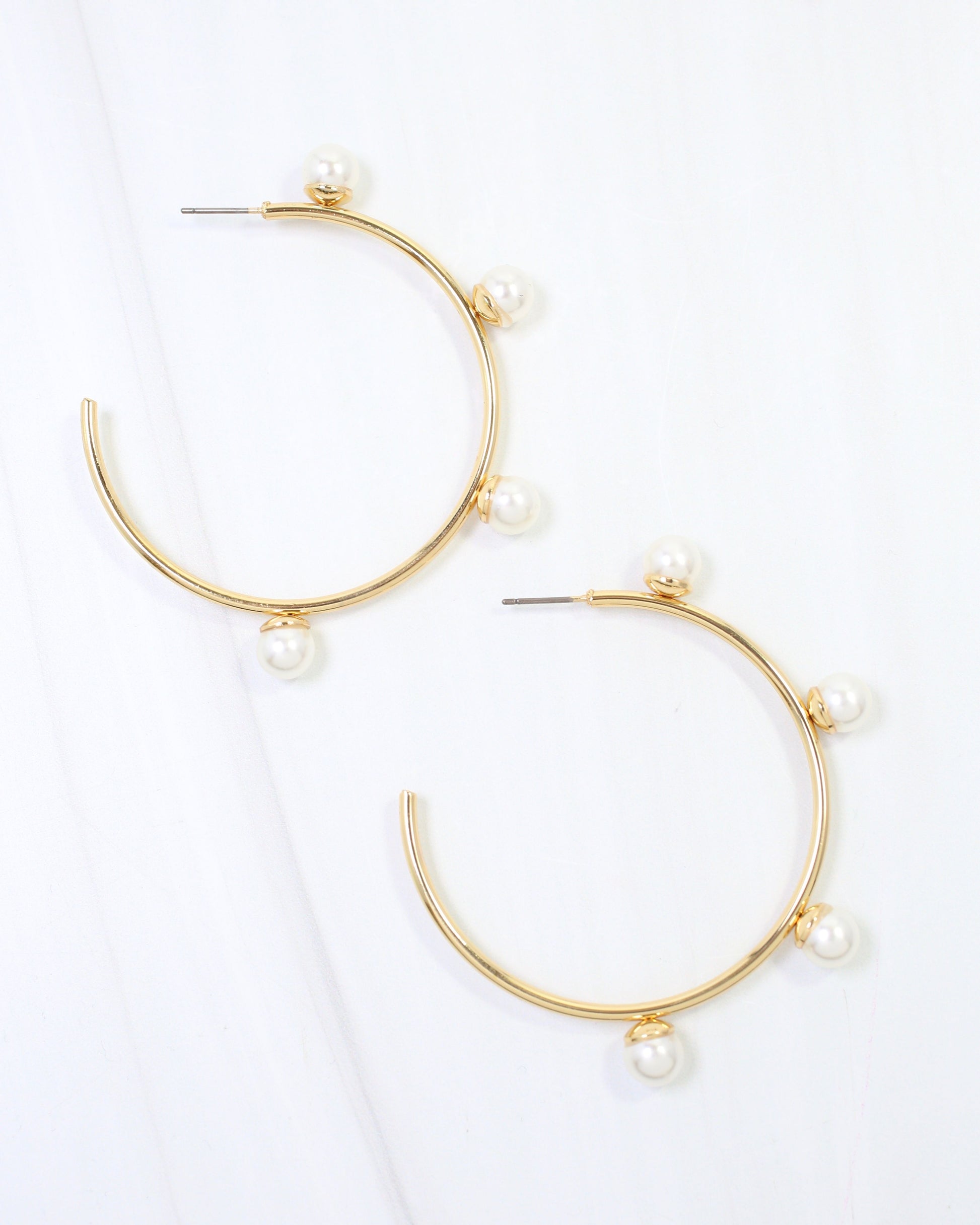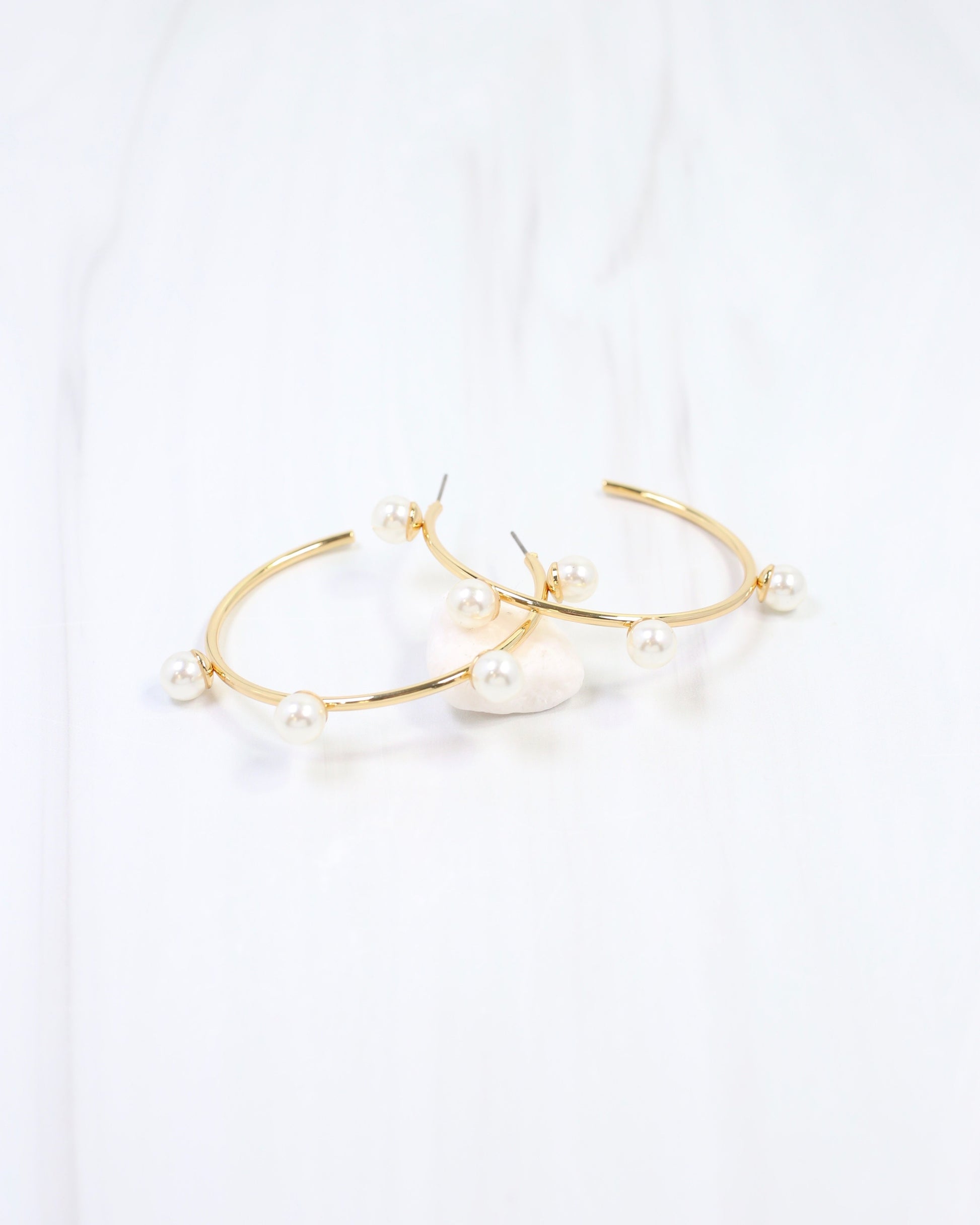 The Welles Pearl Embellished Hoop Earrings feature lustrous pearls adorning classic gold hoops. These refined pieces strike the perfect balance between timeless and contemporary, adding elegant dimension to any outfit.