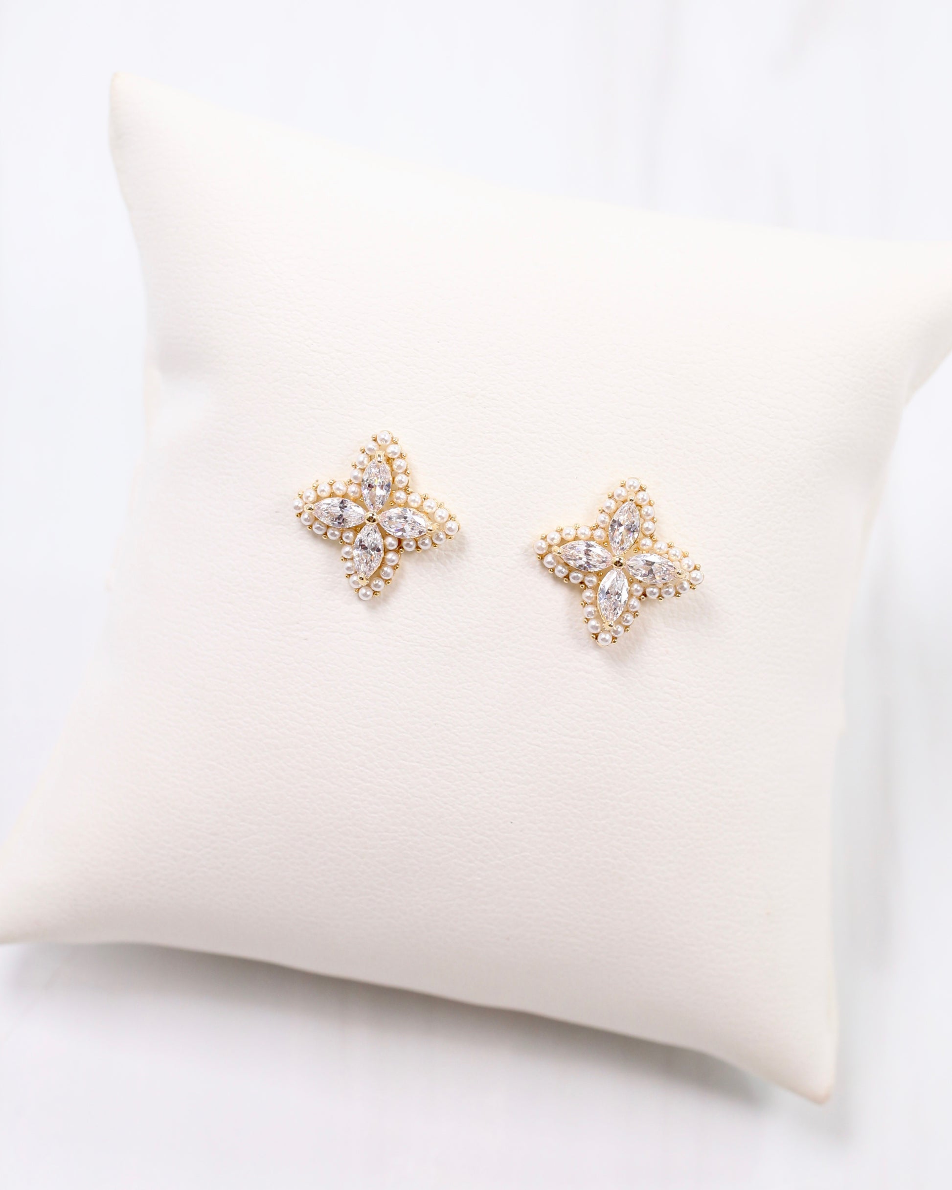 Elevate your style with the Westminster Crystal Stud Gold earrings. These gold-dipped clover studs feature a dazzling CZ pave finish, adding a touch of sparkle and sophistication to any outfit. Perfect for both everyday wear and special occasions.