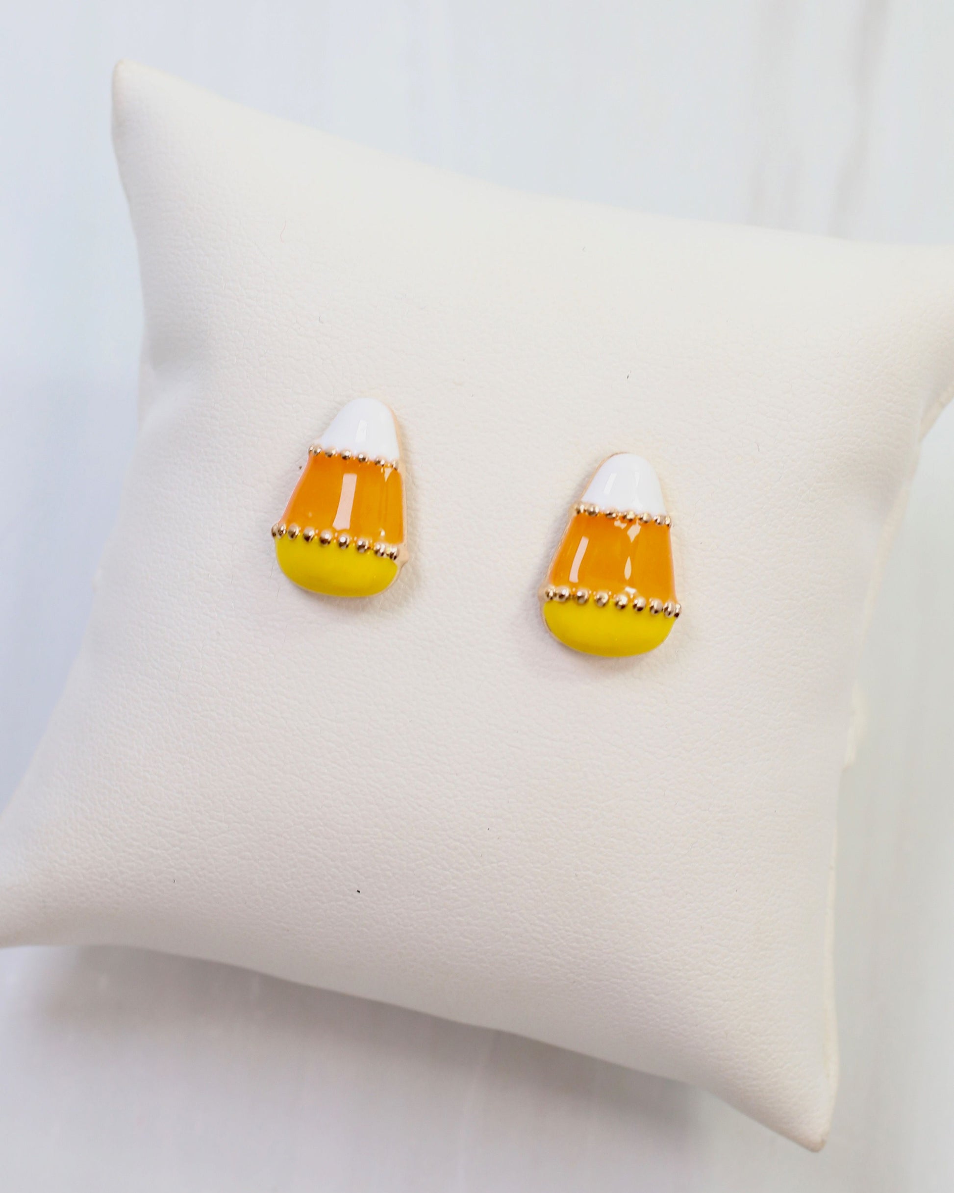 Celebrate fall in style with these Wicked Candy Corn Stud Earrings. Featuring enamel in classic white, orange, and yellow, these charming studs add a playful yet fashionable touch to your Halloween look. Perfect for seasonal flair that’s both cute and trendy.