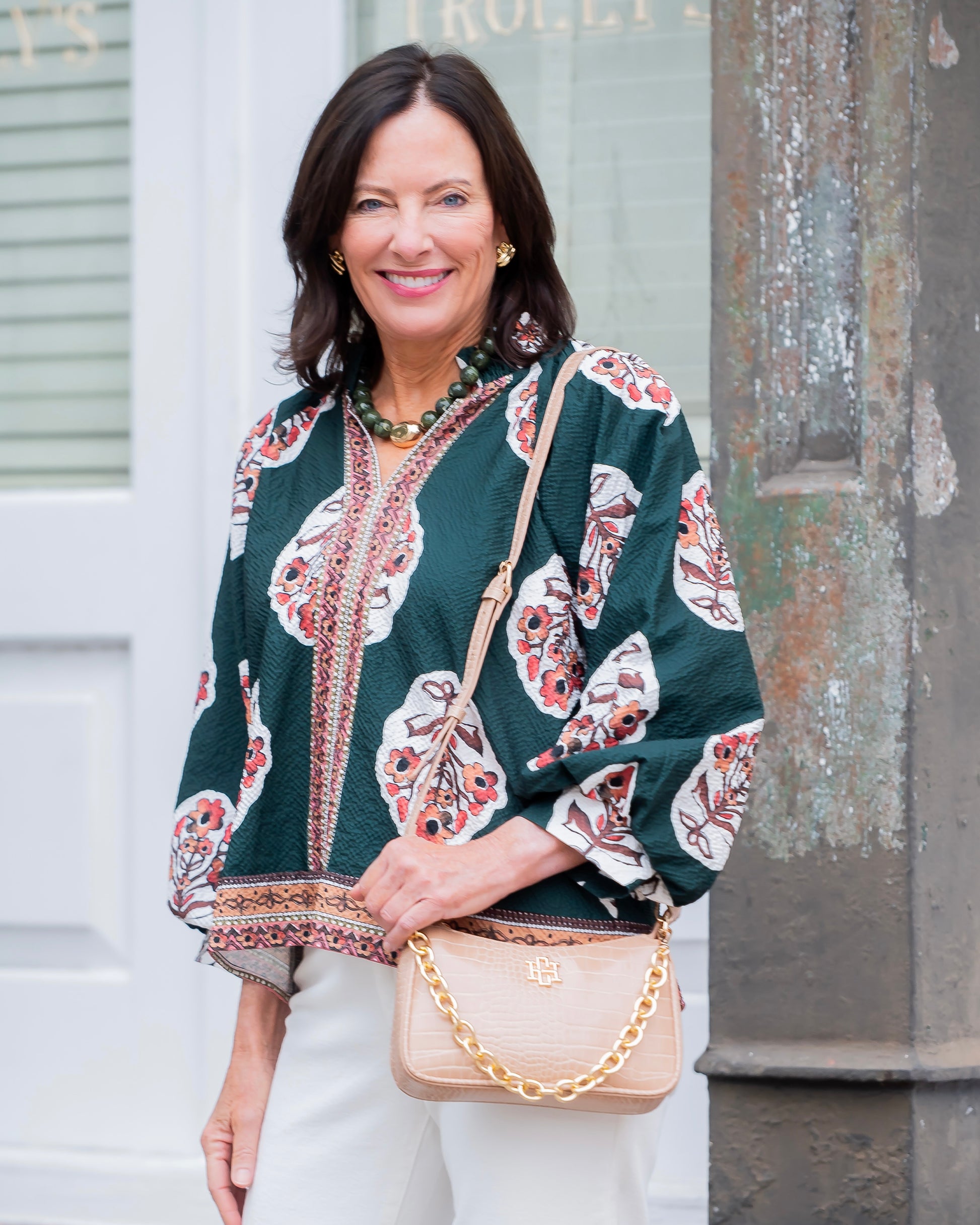 Elevate your wardrobe with the Winfield Floral Print Top in Forest Green. Featuring a stylish split V-neck and wide, flowy 3/4 sleeves, this top offers effortless elegance. The straight hem is accented with a contrasting border print that also highlights the placket and bottom, adding a chic touch. Lightweight and unlined, it’s perfect for layering or wearing on its own for a fashionable, breezy look.