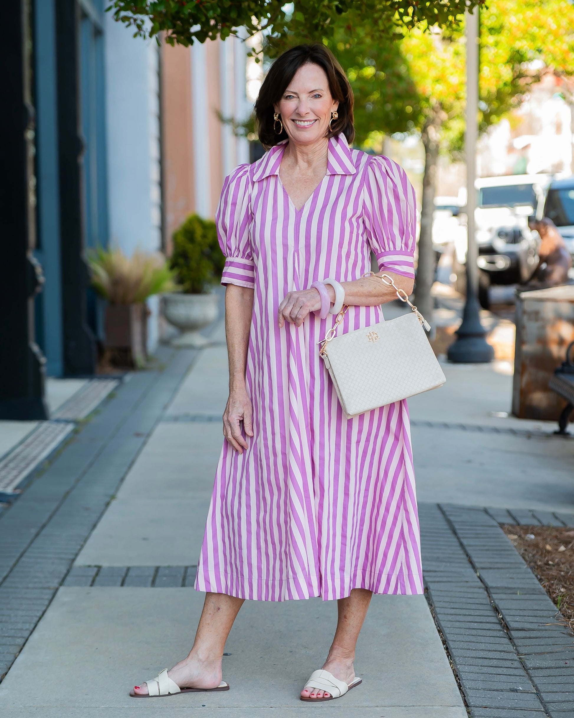 Genesis Striped V-Neck Midi Dress Effortless elegance meets playful style with this striped midi dress. The flattering V-neckline draws the eye upward while the midi length offers versatile day-to-night appeal. Classic stripes add visual interest without overwhelming your silhouette, making this piece a go-to for everything from casual outings to dressed-up occasions. Layer it with a blazer, add sneakers for weekend vibes, or slip on heels for an instant polish. A wardrobe essential that works as hard as you do.